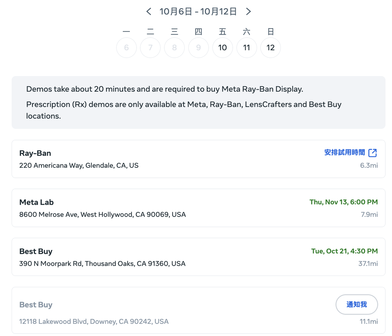 为了应对空前的需求,Meta 也宣布,计划将销售与体验该款眼镜的门店数量增加。官方网站显示,Meta Ray-Ban Display 的演示大约需要 20 分钟。截至 10 月 10日,可以看到部分门店已经可以选择预约本月的体验时间了,不过像早期开放的 Meta Lab 等门店已经排队到了 10月底,甚至 11 月。