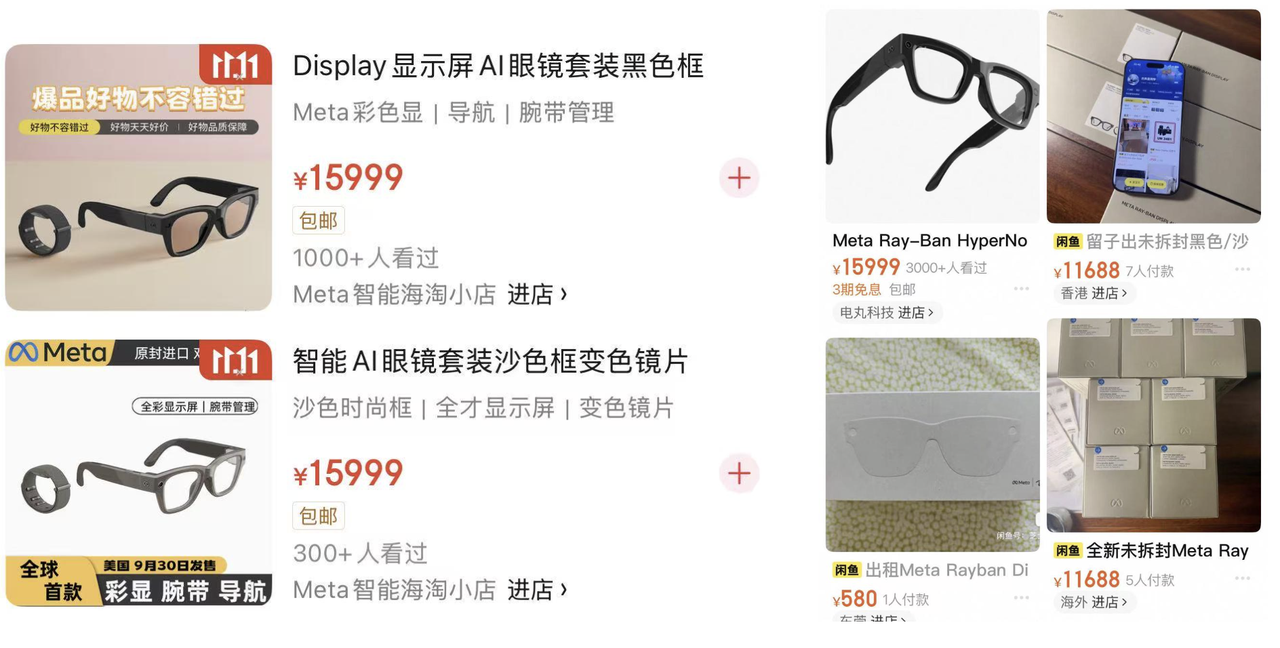 尽管 Meta Ray-Ban Display 尚未在中国大陆正式发售,但这丝毫没有阻挡其在国内市场的热度。在淘宝、京东和闲鱼等电商平台上,这款原价约合人民币 5800 元的眼镜,最高售价已飙升至 15000 元,溢价幅度超过 150%。与此同时,针对这款产品的日租体验服务也应运而生,价格高达每天 600 元。