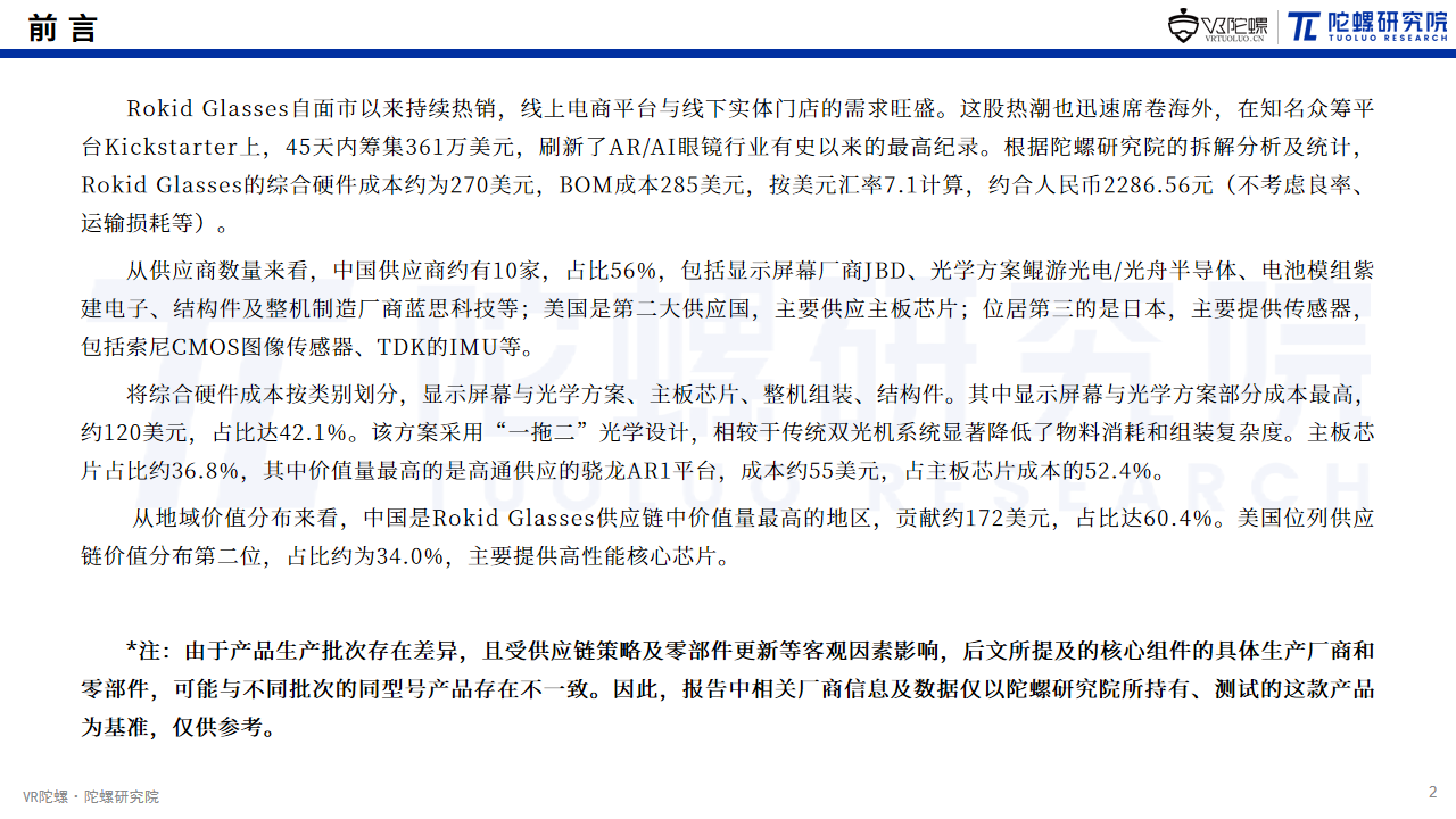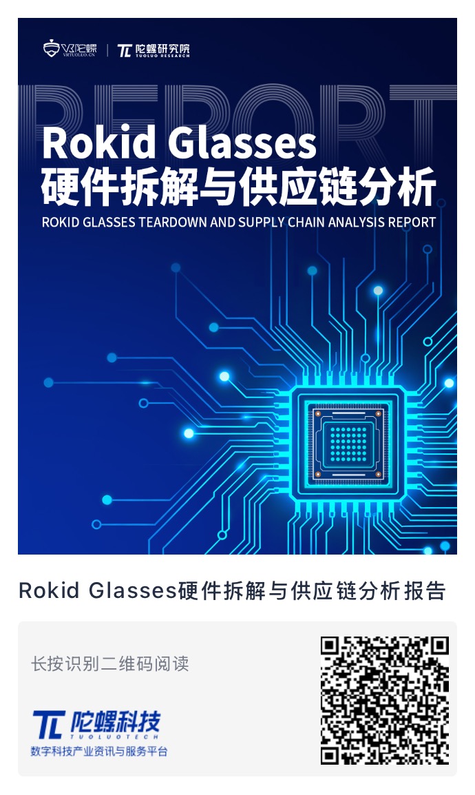 Rokid Glasses自面市以来持续热销,线上电商平台与线下实体门店的需求旺盛。这股热潮也迅速席卷海外,在知名众筹平台Kickstarter上,45天内筹集361万美元,刷新了AR/AI眼镜行业有史以来的最高纪录。根据陀螺研究院的拆解分析及统计,Rokid Glasses的综合硬件成本约为270美元,BOM成本285美元,按美元汇率7.1计算,约合人民币2286.56元(不考虑良率、运输损耗等)。