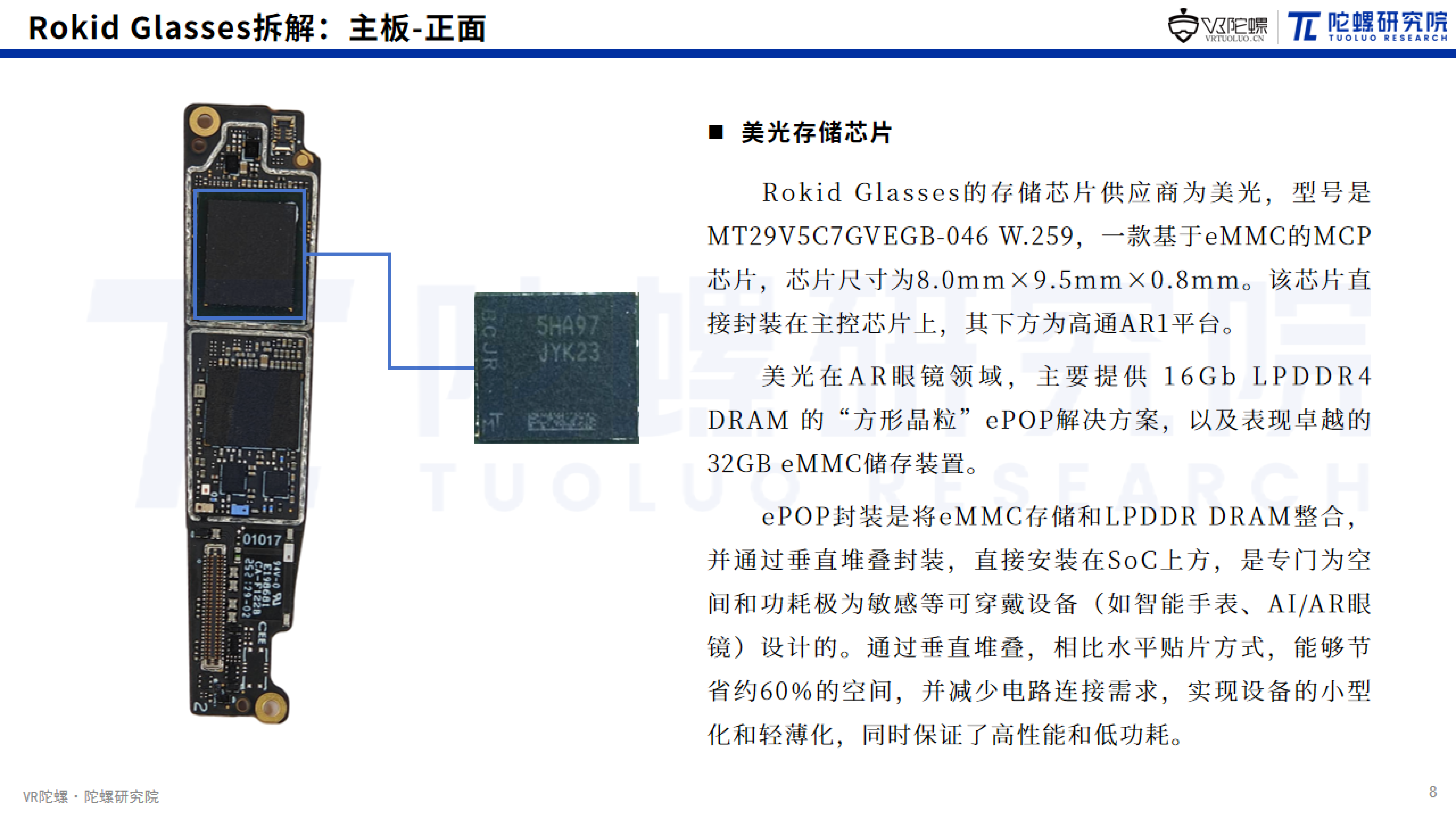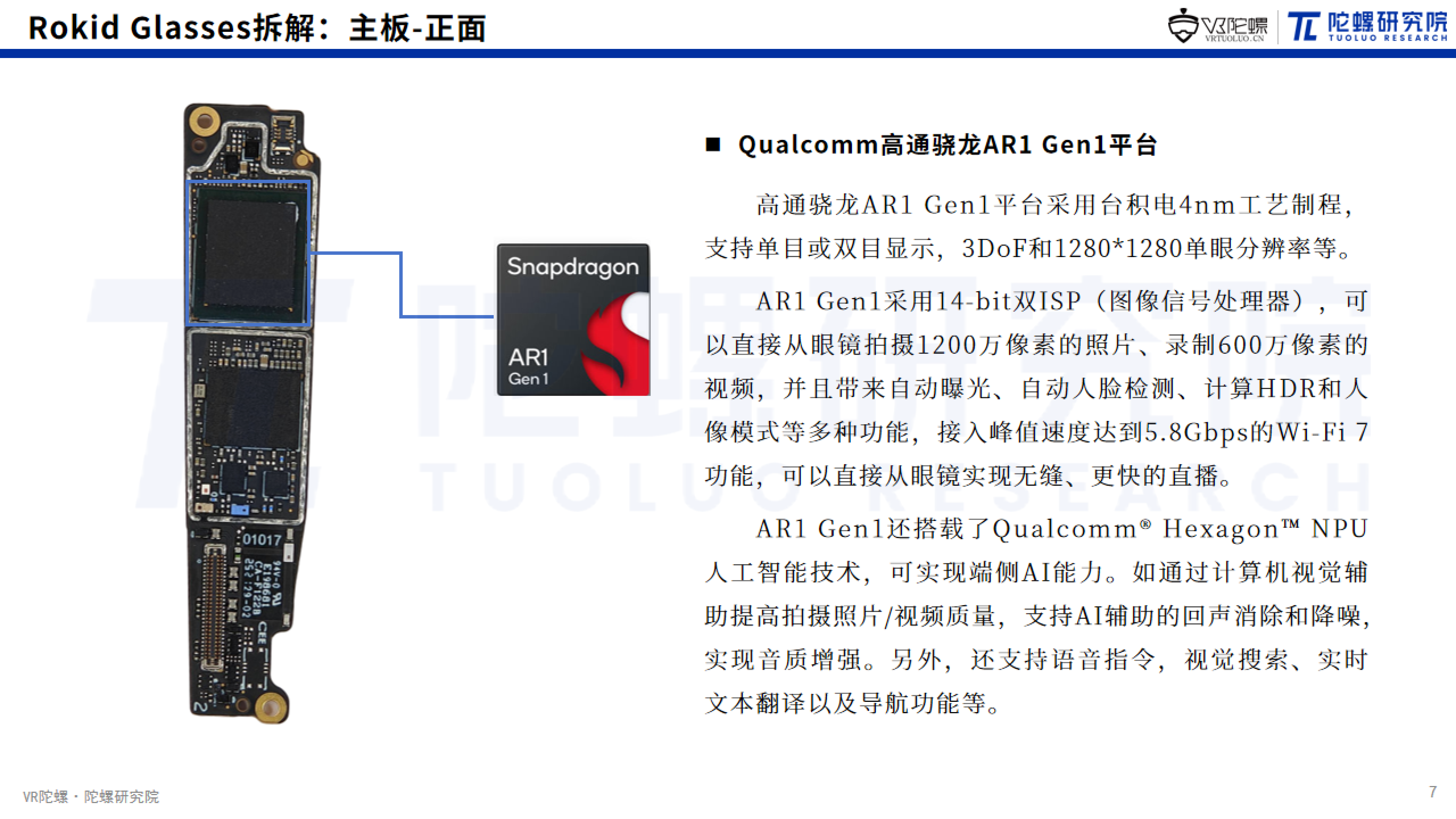 将综合硬件成本按类别划分,显示屏幕与光学方案、主板芯片、整机组装、结构件。其中显示屏幕与光学方案部分成本最高,约120美元,占比达42.1%。该方案采用“一拖二”光学设计,相较于传统双光机系统显著降低了物料消耗和组装复杂度。主板芯片占比约36.8%,其中价值量最高的是高通供应的骁龙AR1平台,成本约55美元,占主板芯片成本的52.4%。