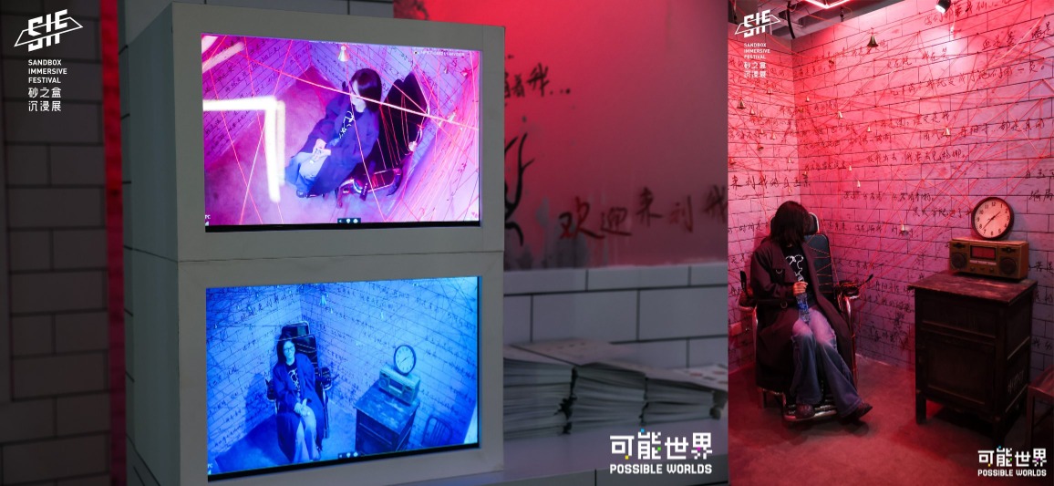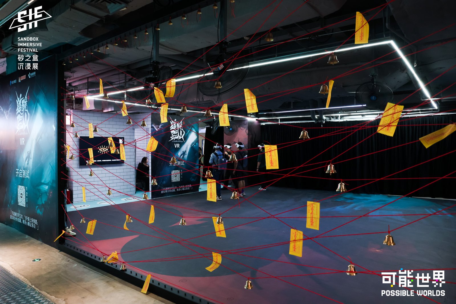《道诡异仙VR》首先给用户带来深刻印象的是现场环境,体验区打造得仿佛是一间心理咨询机构机构,工作人员们甚至穿起白大褂,场景四周则由红线、铃铛和符咒营造出类似结界的效果。在试玩区以外还设有一间红光照射、狭窄逼仄的拘束室,屋外则提供了监控器视角,烘托出原作IP的诡异氛围。试玩过后用户还可以领取病历单,填写心理状态等。可以说从用户进入VR大空间、到离开VR大空间,都有实景作为过渡。相比市面上大量以定位符号的墙纸铺满场景、外观近似的VR大空间体验而言,《道诡异仙VR》从置景上就先声夺人。