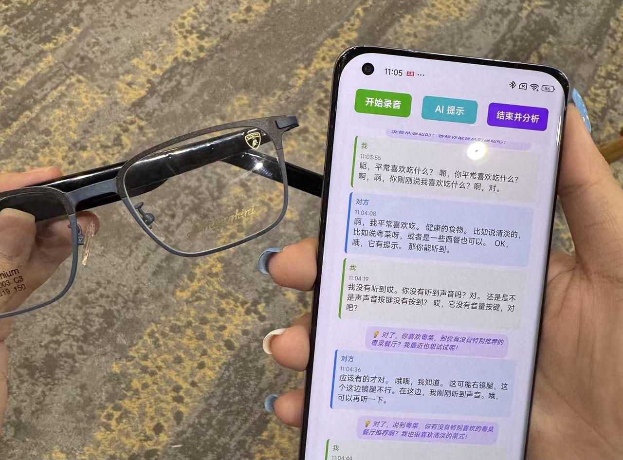 垂直场景探索: 拂曦科技展示了一款专注于约会场景的 AI 眼镜,其核心功能是为社交障碍用户提供实时的语音提示和话题建议,辅助线下交流。