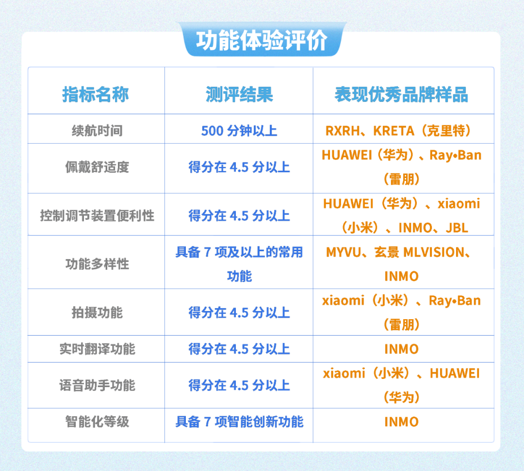 公告指出,实验室检测是对样品的热灼伤、声能量源的安全防护、视网膜蓝光危害、静电放电抗扰度、信息安全等指标进行测试,功能体验评价是对消费者关注的续航、佩戴舒适度、按钮或其他调节装置的使用便利性、功能多样性、拍摄图像质量、实时翻译功能、语音助手功能、智能化等级等指标和功能进行测试与体验评价。
