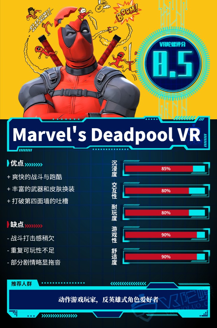 《死侍VR》已构建出一个极具扩展性的框架,为广大VR玩家带来了一款与去年《蝙蝠侠 阿卡姆之影》风格截然不同的超英游戏,给年末的“黑五”商战注入一剂强心针。若能通过后续更新强化战斗手感、追加更具挑战性的玩法模式,并推出中文等更多语言字幕的支持,相信有望成为Quest平台的又一款长卖作品。