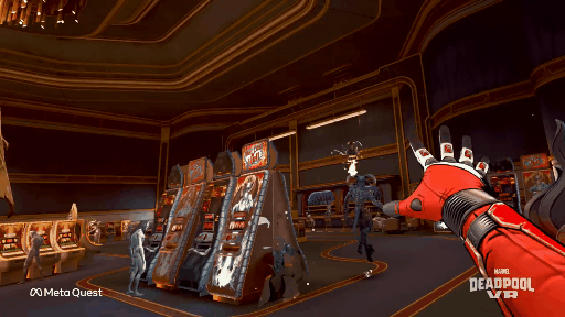 《死侍VR》提供近10小时的主线流程内容,核心设计基本都是在一个相对宽阔的场景中消灭敌人,相当于VR中常见的“斗技场类ACT游戏”的升级版。在斗技场之间则通过一些简单解谜或跑酷流程衔接,以丰富玩法并调整游戏节奏。不同关卡的斗技场还会融入独特的场景元素,敌人的专属装备也会为战斗带来变化。
