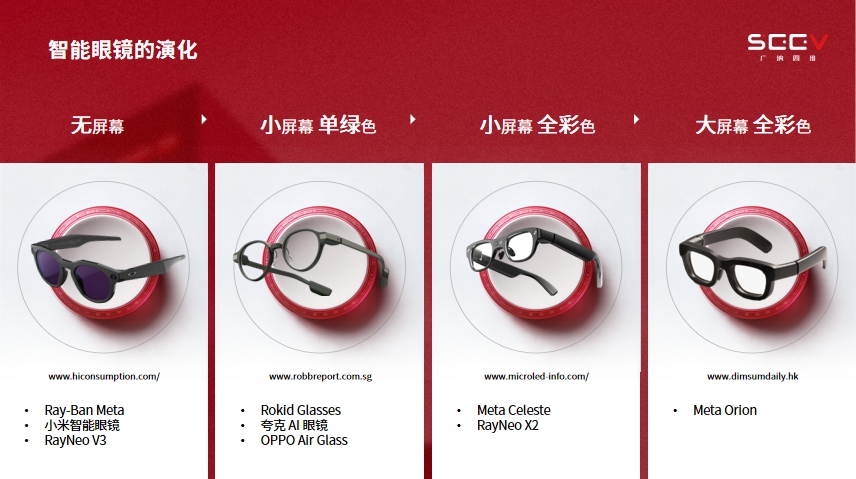 其实人类对彩色的需求也是非常旺盛,因为彩色所带来的信息通道会更多。像雷鸟发布的RayNeo X3 Pro,小屏幕+全彩,有小屏幕其实还是不够的,如果人们需要和 AR 进行互动,我们需要大屏幕+全彩色的。这是在 2024 年 Meta 推出来的 Meta Orion,一个大屏幕+全彩色的显示。所以智能眼镜是从没有显示到小屏幕的单绿色显示,然后再到小屏幕全彩色,直到大屏幕全彩色这样一个发展历程。