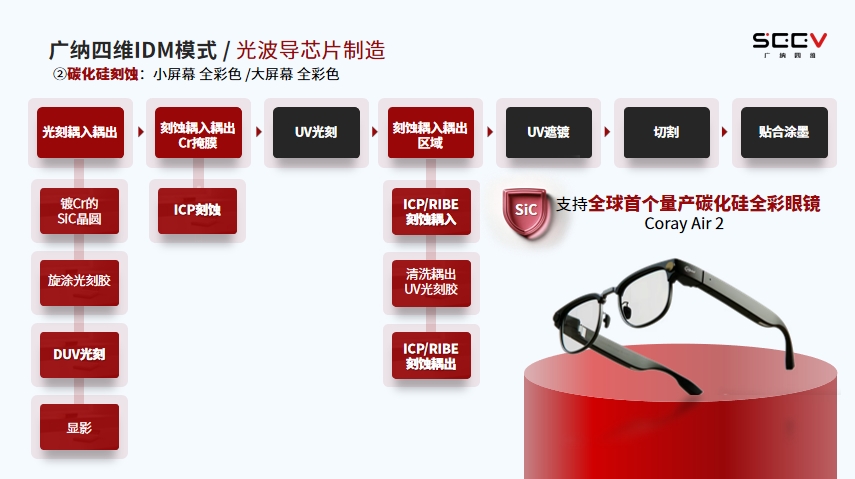 第二条技术路线是碳化硅刻蚀,主要用于小屏幕和大屏幕的全彩光波导。该路线同样采用 UV 光刻,结合 ICP 或 RIBE 的刻蚀与遮镀工艺,流程与半导体制程高度一致。基于这一工艺,我们成为全球首个碳化硅刻蚀量产眼镜——Coray Air 2 的供应商,支持其发售基于碳化硅刻蚀的全彩光波导产品。