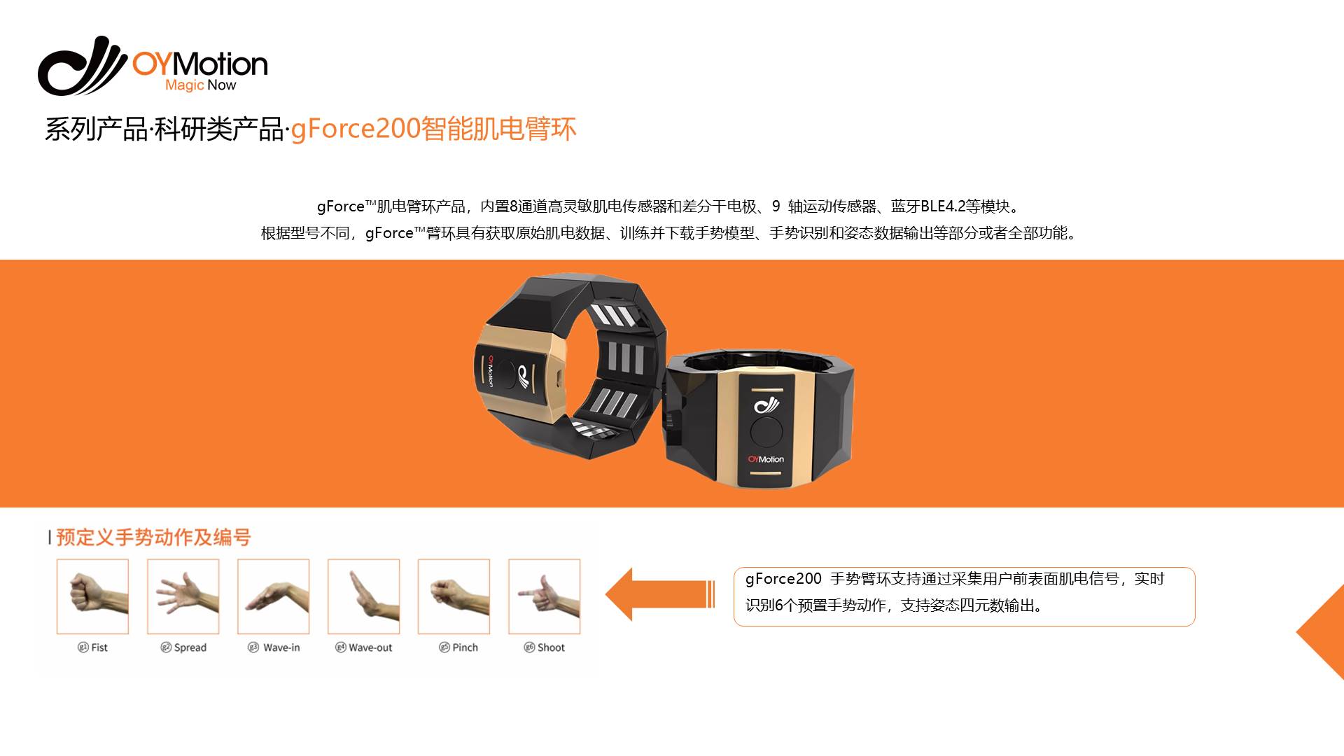 这是傲意的第一款产品,gForce肌电臂环。它的原理比较简单:当人的手做不同手势,比如握拳、伸掌时,会产生不同的肌肉电信号,这属于外周神经信号。我们通过臂环内的肌电传感器感知这些信号,进而识别对应的手势。