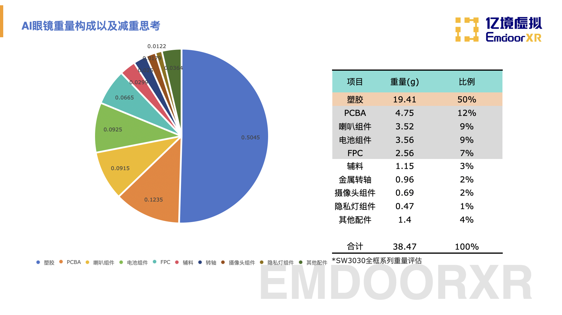 •重量:目前主流AI眼镜重量在36g-38g左右。拆解来看,塑胶材质占了总重量的50%,PCBA和器件占比很小。因此,减重的核心在于材料。 目前行业多用TR90,密度约1.0。我们正与巴斯夫等厂商合作尝试超低密度材料(密度约0.83),但这会显著增加量产难度。我认为,极致的轻量化目标可以追求到32g-33g,再往下减就非常困难了。
