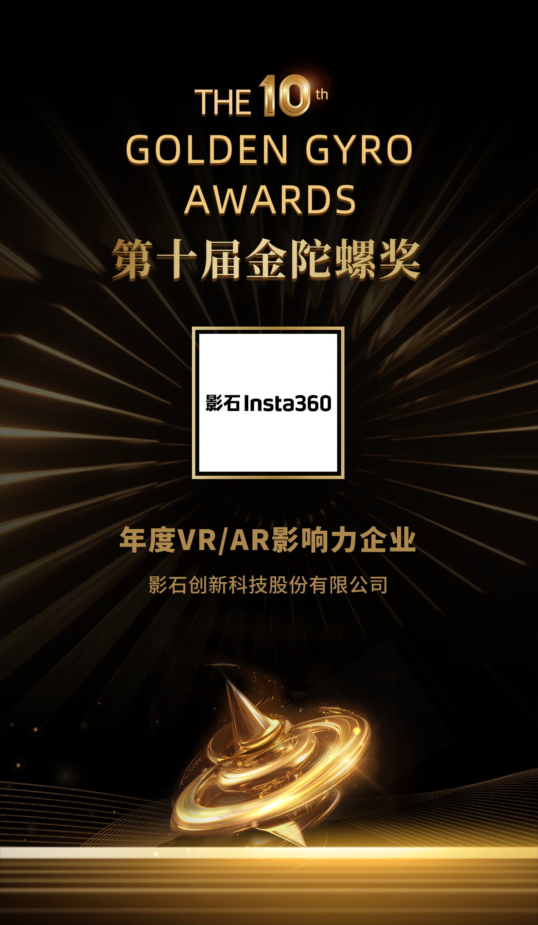 经历为期3个月的线上投票、专家评审,影石创新科技股份有限公司荣获第十届金陀螺奖“年度VR/AR影响力企业”。