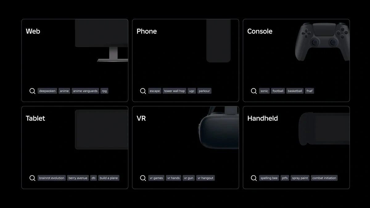 在手机这种最普及的设备类型上,用户偏爱恐怖、逃脱和障碍赛类游戏,这表明他们渴望紧张刺激、直击人心的挑战。平板电脑用户则更倾向于搜索《Build a Plane》和《Dress to Impress》这类创意十足的游戏,以便充分利用更大的触控屏幕。而PlayStation和Xbox等游戏主机用户则更热衷于热门、动作类和授权游戏,这表明他们更注重竞技性,例如索尼克、足球和篮球等相关内容。