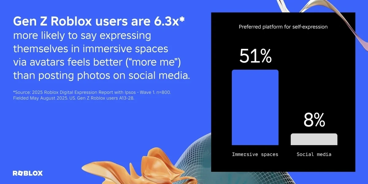 自我表达也很重要,Roblox和Ipsos联合发布的《2025年Roblox数字表达报告》的最新研究印证了这一点。根据我们最近的自我表达调查,受访的Z世代Roblox用户更换虚拟形象的原因包括:表达创造力(47%)、尝试新的身份(38%)、脱颖而出(38%)或契合心情(37%)。预计到2025年,用户平均每天将更新虚拟形象2.74亿次。