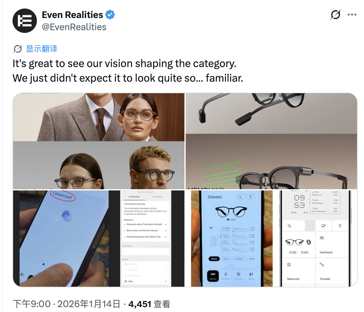 1月14日,AI眼镜品牌Even在社交平台发文表示:很高兴看到Even的愿景正在塑造这个品类,只是没想到它看起来会如此……熟悉。