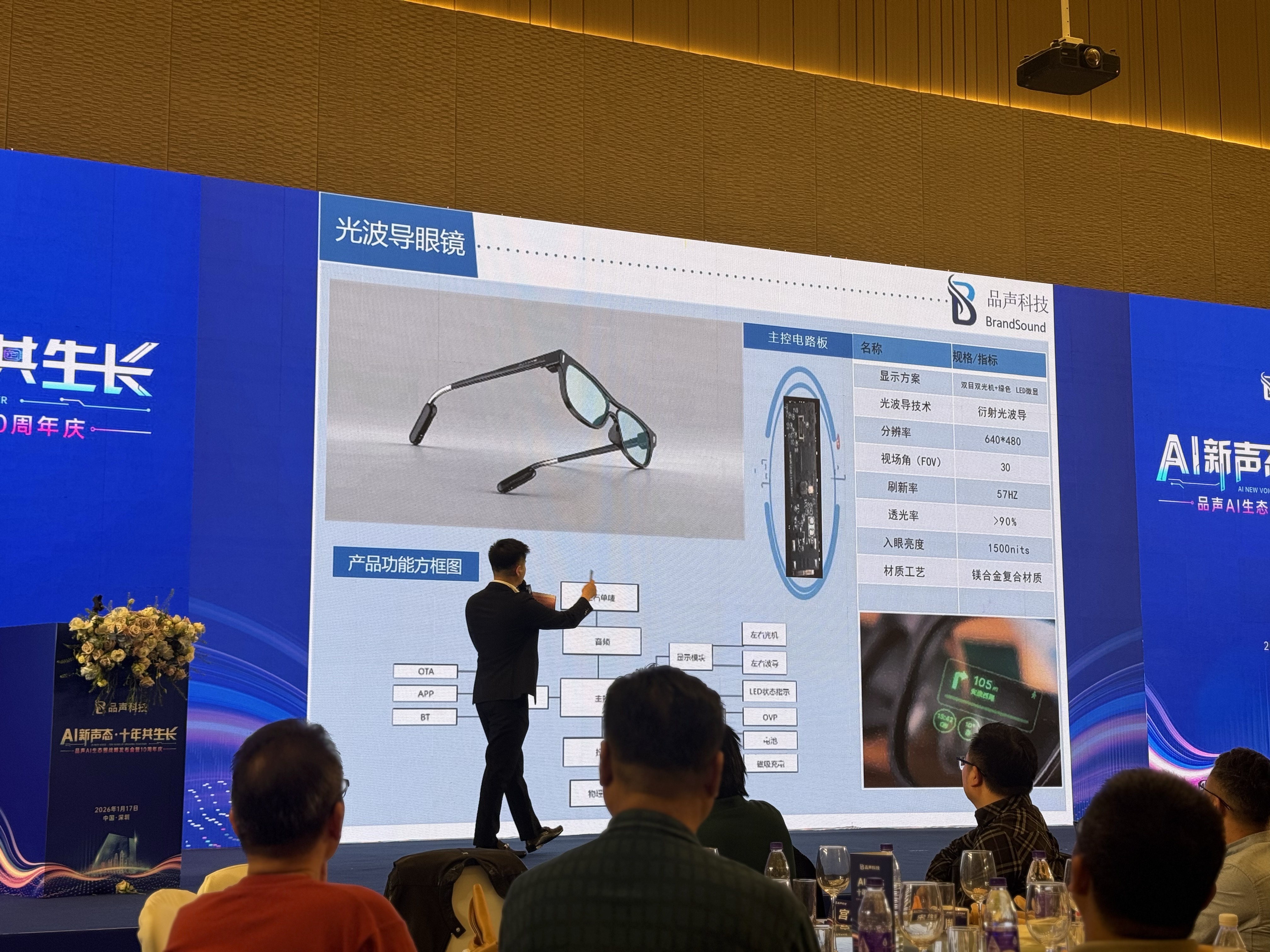 据介绍,品声科技的光波导眼镜方案采用衍射光波导技术,搭载双目单绿色Micro-LED光机。其光学显示分辨率为640×480,视场角(FOV)达到30°,刷新率为57Hz。镜片透光率高于90%,兼顾清晰视野与真实场景融合。入眼亮度为1500nit,确保在明亮环境下仍能清晰显示。整体采用镁合金复合材质,兼顾轻量化与结构强度,适用于全天候佩戴与高负荷使用场景。