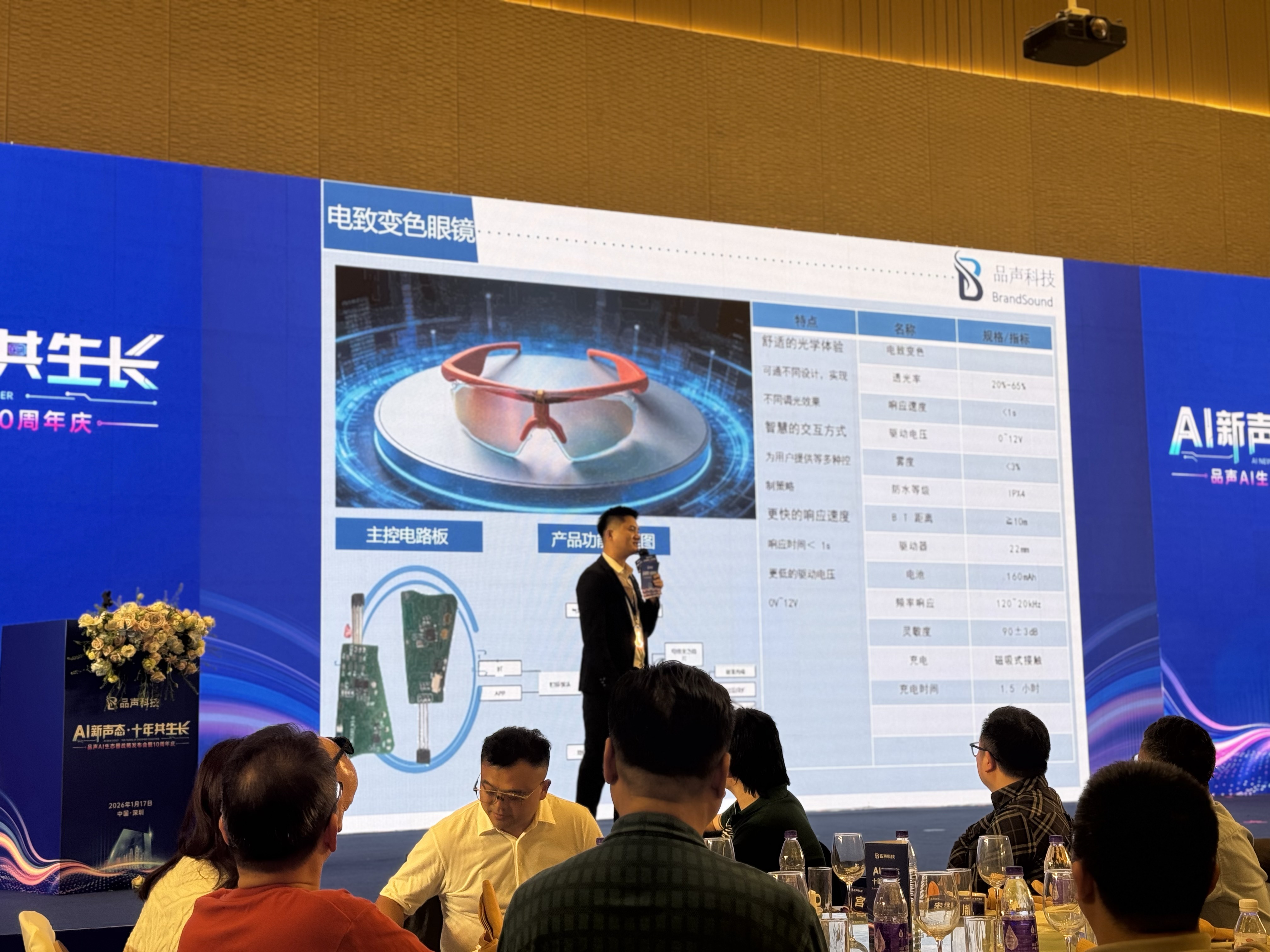 此外,针对户外场景,品声科技还带来了AI运动眼镜,该眼镜不带显示,但拥有电致变色镜片,透光率可在20%至65%之间智能调节,响应时间小于1秒。镜片驱动电压范围为0–12V,雾度低于3%,确保调光过程中视觉无明显模糊。具备IPX4防水等级,适合户外多变光线环境。此外,内置光学传感器支持环境光自适应与用户手势识别,配合160mAh电池与磁吸充电,实现全天候舒适视觉调节与智慧交互。