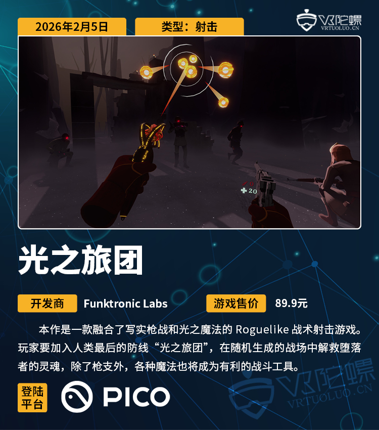 本周PICO平台迎来一波强势更新。《光之旅团》(The Light Brigade)最初于2023年2月问世,经过两年多的更新优化趋于完善,如今终于由影核引进发行。该作曾荣获TGA 2023“最佳VR/AR游戏”提名、PlayStation Blog 2023“年度PS VR2游戏”提名等诸多奖项,确实是一款优质的VR射击佳作。