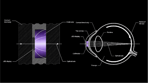 智能隐形眼镜放置在视网膜区域,但是眼睛无法聚焦非常近的光源,因而需要设计一套全新的显示系统。