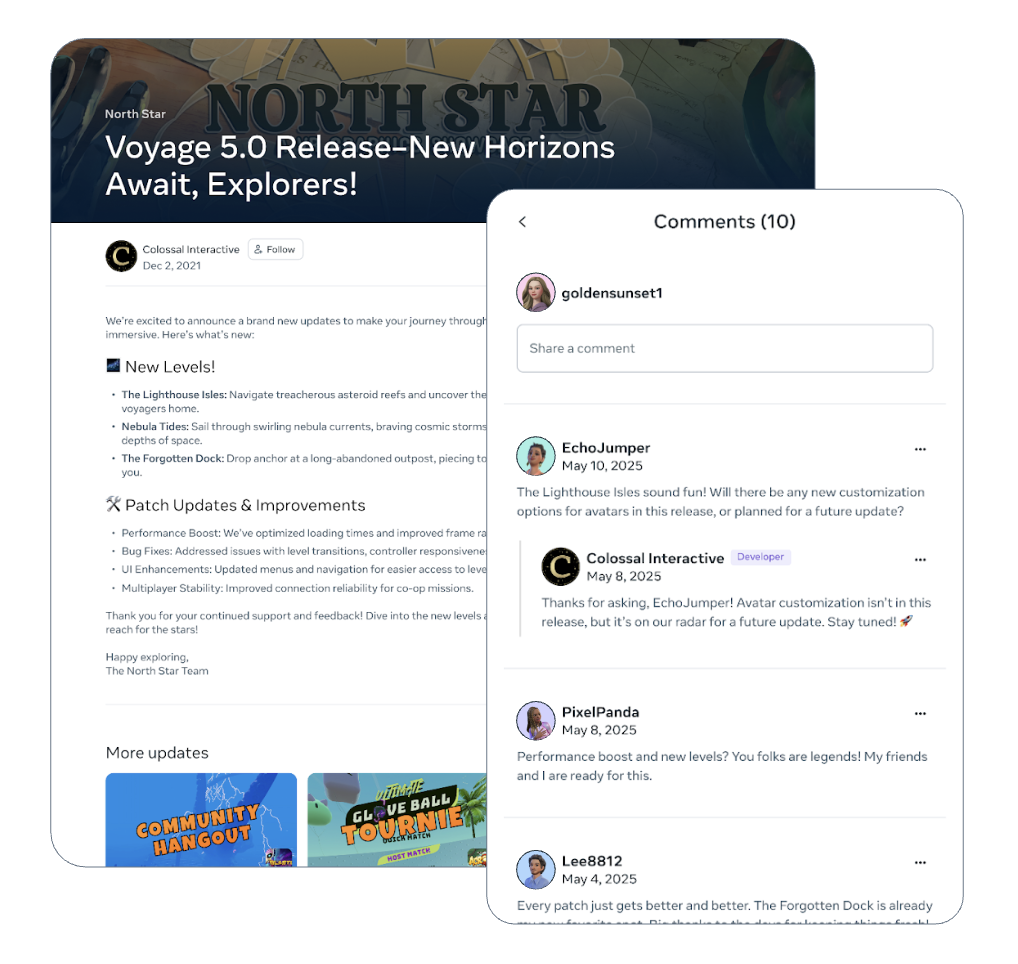 还有一个值得重视的变化是,Meta正在完善的,已经不只是分发入口,而是围绕“发现—转化—复购—持续运营”建立起一整套工具链。比如他们提到,商店会继续增加像Deals tab这样的入口;同时继续推进Season Passes、Featured Bundles、Developer Posts、Developer Profiles以及评分和评论体系的优化。Developer Posts也不再只是一个发公告的位置,而是在往“评论反馈 + 附加内容转化 + 实时数据分析”的完整运营入口发展。