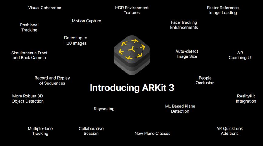 2019年WWDC,ARKit3.0版本推出,提供了动作捕捉、协同会话、人体遮挡等功能。并在更大程度上推广 AR Quick Look 基于浏览器的AR功能,以及AR开发工具 Reality Composer等。