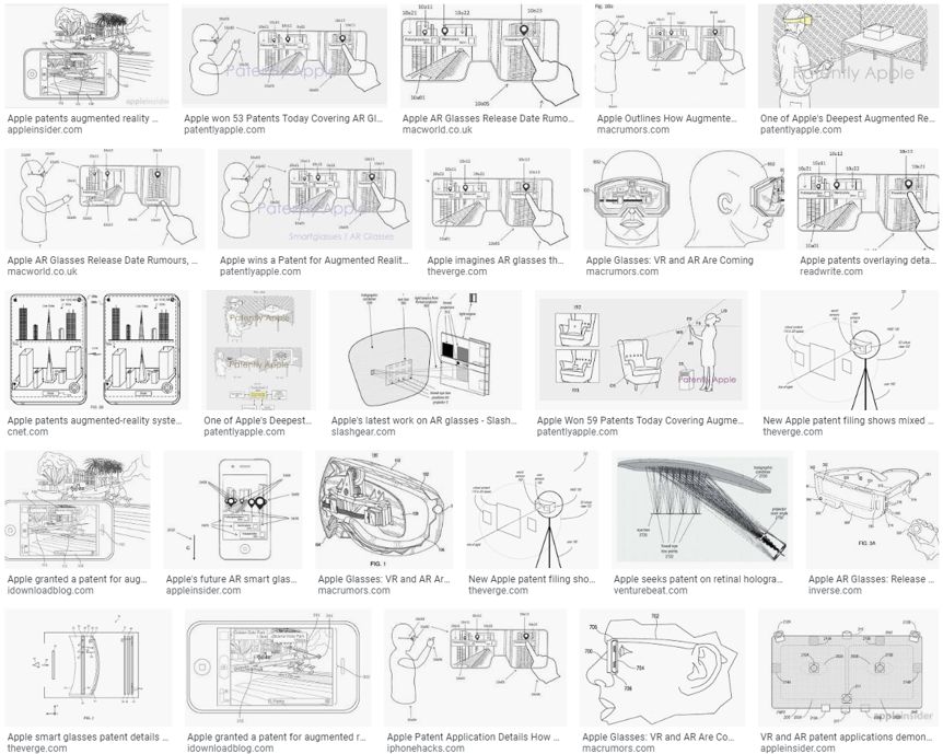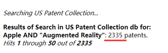 诸如此类的专利还有很多,从美国专利商标总局官网以“苹果”、“Augmented Reality”(AR全称)为关键词进行搜索,可以找到多达2335项相关专利。