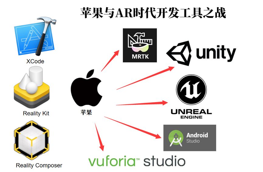 苹果这些开发工具虽好,却只能用于开发iOS平台应用,而用户显然不可能只使用苹果的设备,当今AR市场风云变幻,除了安卓平台的ARCore还有Vuforia、SenseAR、HuaweiAR、EasyAR、VoidAR等群雄逐鹿。在MR眼镜平台,有微软的Hololens MRTK、创业公司Magic Leap,以及国内众多MR眼镜厂商自己的开发平台。但开发工具往往依赖编程语言,所以大部分AR技术公司不会选择自研开发工具。苹果在开发工具方面的对手并不是创业公司,所以可能更接近上图情况。