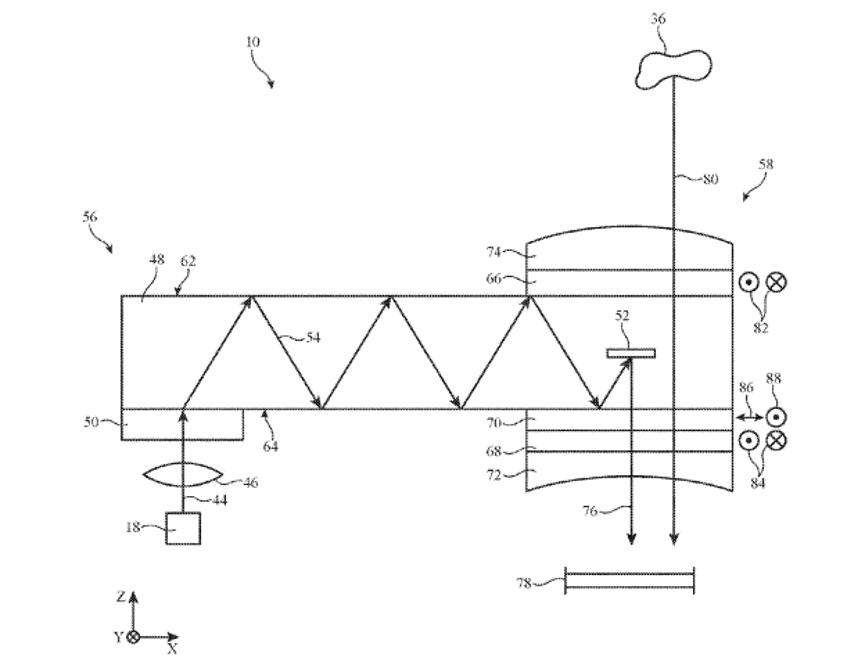 同月,美国专利商标局公开苹果一项与MR头显光学相关专利,据了解,这专利指出一种透镜可调节的光波导光学系统,,可以让头显体积更小。而这MR头显采用分体式设计,可与iPhone、iPad或mac相连,并可采用叠加多层高透明度材料(玻璃或塑料)平面光波导,并且支持普通AR模式和摄像头透视模式。而MR头显的输入和输出耦合器或采用布拉格光栅、棱镜、有角度的透明结构或透镜结构,可采用全息耦合元件衍射耦合结构。
