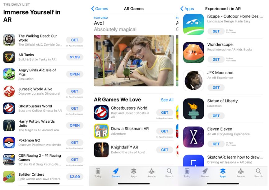 据统计,仅2019年,苹果商店上线AR应用就超过4000款,包括游戏、工具、旅游、商务等多个类型。苹果为此特地在AppStore中设置了AR游戏和AR应用的专栏,并为用户推荐优质iOS 平台AR应用。
