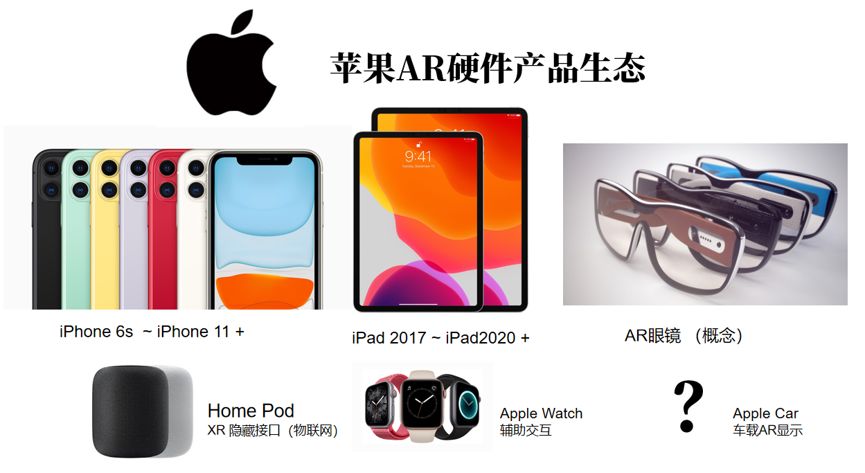 从PC时代的电脑,到移动互联网时代的智能手机,再到AR时代的眼镜头显,苹果具有强大的硬件生态体系。不论iPhone还是iPad,从近几年的发展来看,这些产品对AR技术的支持都越来越好。