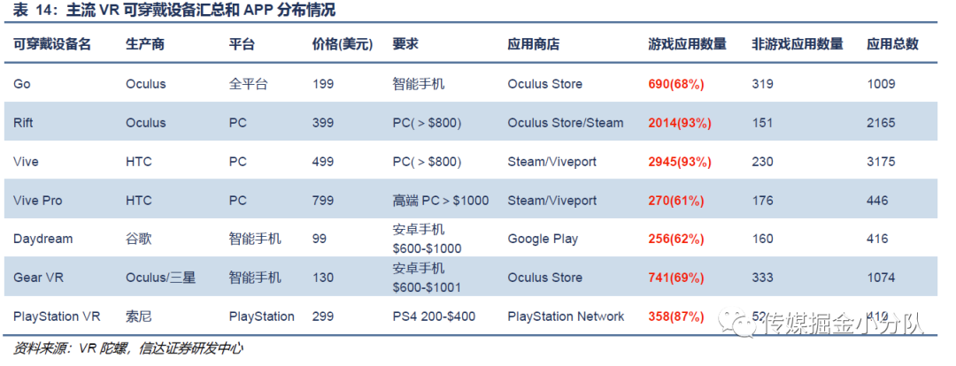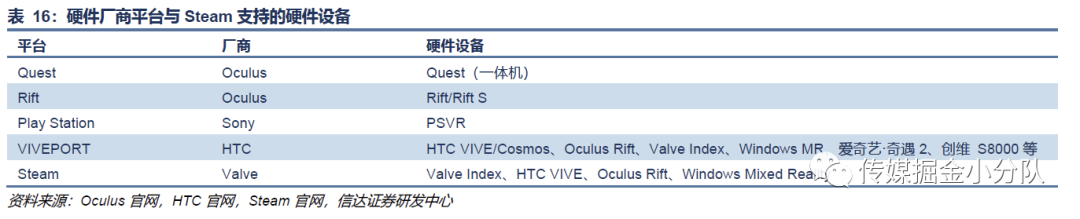 游戏平台布局上,用户与内容数量保障SteamVR在PC端的优势地位。截至2020年3月27日根据四大平台官网的数据,Steam中VR游戏与软件数量达到4164个远超VIVEPORT与Oculus RIft商店中 PCVR的内容,数量最少的是索尼PSVR仅有419个。Steam本身多硬件覆盖带来的用户量刺激了VR开发者的开发动力,使得VR内容数量大幅超过其他竞品平台。VR内容增长又进一步带动了硬件厂商适配SteamVR,SteamVR用户量增长。整个过程形成了良性循环,保障了SteamVR在PC端的优势地位。