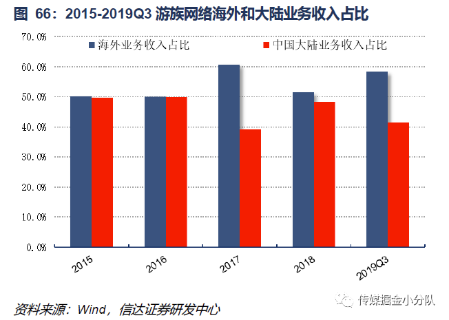 海外发行持续发力,获得多家大IP代理权。2018年公司加速全球化和区域化布局,新建新加坡研发中心,并在印度、土耳其、韩国、泰国均设立了分公司。截止到2019年上半年,公司的发行网络已覆盖了全球超过200多个国家和地区,在全球已经成立了9个地区发行和运营中心海外用户覆盖超过8亿,占到公司全部用户三分之二以上,海外市场贡献公司收入占比达58.4%。2019年上半年公司在港澳台、东南亚市场发布了由腾讯研发、车田正美工作室正版授权的策略卡牌手游《圣斗士星矢》,很快就登顶相关市场畅销榜,还发布了游族自研手游《天使纪元》等。在欧美,2019年3月,游族获得授权研发、发行的页游《Game of Thrones Winter is Coming》(《权力的游戏:凛冬将至》)英文版启动公测,上线后四次获得Facebook全球推荐,目前已上线英德法葡等14种语言;经典产品《天使纪元》在欧美地区上线以来累计注册用户超过千万。2020年上半年公司计划上线海外的2款重磅产品为《少年三国志2》和《权力的游戏》手游版。未来储备新品这一块,游族比较擅长的MMO类如王者围城有望接档狂暴之翼、天使纪元等3DMMO类的产品。日本、韩国已经上线的完美世界开发的《神魔大陆》、日本及东南亚代理的《塞尔之光》等等代理新品将继续发力。另外自研这块,少三零、盗墓笔记国内上线之后会在2020H2上线海外。