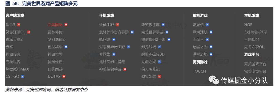 端游、手游、主机游戏、电竞构造多元化产品矩阵。端游方面,《诛仙》、《完美世界国际版》、《DOTA2》、《CS:GO(反恐精英:全球攻势)》等持续贡献稳定收入。2018年6月,公司与Valve公司达成战略合作,共同建立Steam中国,打造为中国玩家量身定制的PC端游戏分发平台。2019年8月,公司协助Valve公司在上海成功举办《DOTA2》2019年国际邀请赛(Ti9),这也是Ti系列赛事首次在中国举办,推动公司电竞业务的进一步增长。手游方面,《诛仙手游》、《完美世界》手游等旗舰产品延续稳定表现。2019年7月底上线的金庸正版IP手游《神雕侠侣2》上线后稳居iOS畅销榜前列,备受玩家认可。储备的游戏产品包括《我的起源》、《新笑傲江湖》、《新神魔大陆》、《梦间集天鹅座》、《梦幻新诛仙》、《战神遗迹》、《幻塔》等,涵盖MMORPG、回合制、ARPG、SLG、Roguelike、卡牌等多种类型。主机游戏方面,2019年上半年,公司陆续推出了旗下中法团队合作研发的《非常英雄(UnrulyHeroes)》、国内团队自研的多边不对称生存游戏《DON'TEVENTHINK》,获得玩家广泛关注。2019年8月,由公司发行的端游及主机双平台游戏《遗迹:灰烬重生(Remnant:FromtheAshes)》上线,为公司带来了良好的收益。