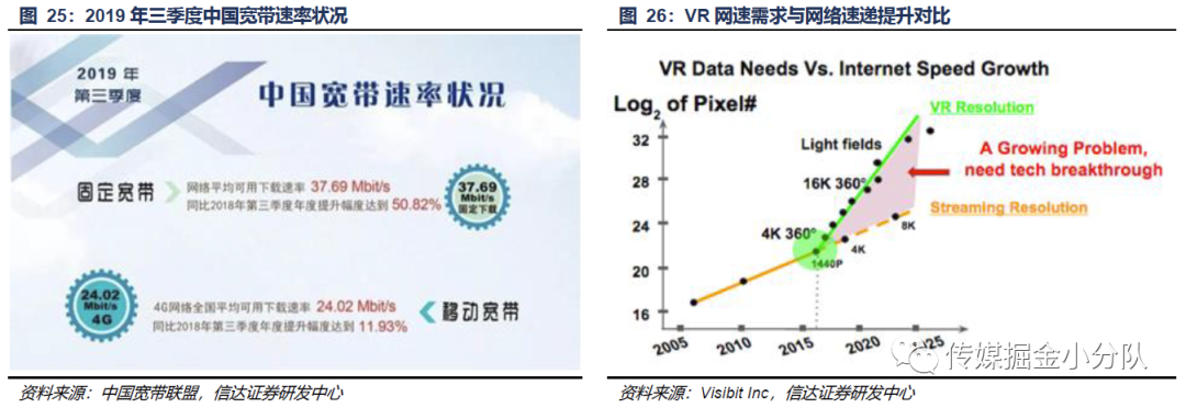 5G大带宽特性使用户能在各种环境流畅观看高分辨率全景视频、VR直播等VR内容。根据中国宽带联盟数据,2019年第三季度,中国平均固定宽带平均可用下载速率为37.69Mbit/s,很多用户无法流畅在线观看高质量的VR视频内容,以目前的平均宽带速率只能观看2k分辨率的普通视频。根据Visibit数据,VR内容质量逐渐上升情况下,宽带网速发展会逐渐落后。而在4G网络下,网速平均只有24.02 Mbit/s ,VR设备更是无法流畅浏览高质量全景视频。这同时限制了VR一体机外出携带时的应用场景。5G在用户体验上就能达到1024Mbp/s,完全可满足视频需求,且能进一步满足未来VR高质量视频的带宽要求。5G技术的进一步落地,将推动VR内容完成从传统视频,到全景视频,在线游戏,体育赛事直播等的多样化覆盖过程。