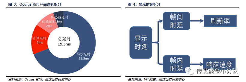 显示时延是VR设备时延的最主要成分,延时占比达 69%。以Oculus Rift为例, Oculus Rift总延时为19.3ms,其中屏幕显示延13.3ms 为,计算延时为3ms,传输延时为2ms,传感器延时为1ms。屏幕显示延时占比达69%。