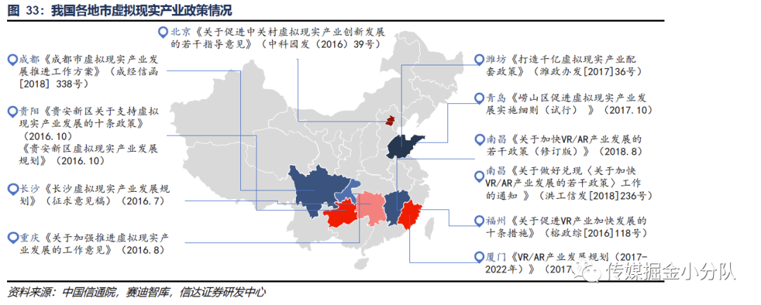 我国的虚拟现实产业起步较晚,2016年进入VR产业元年后,政府开始频繁发布各项政策大力支持和鼓励我国的虚拟现实产业的发展,部省联动政策框架体系逐步形成,虚拟现实产业进入政策红利释放期。中央层面,2018年12月25号工信部发布了《加快推进虚拟现实产业发展的指导意见》,指出要抓住虚拟现实从起步培育到快速发展迈进的新机遇,加大虚拟现实关键技术和高端产品的研发投入,创新内容与服务模式,建立健全虚拟现实应用生态。地方政府层面,各地根据自身特点陆续制定了地方虚拟现实产业政策或行动计划,并陆陆续续成立了以北京、南昌、成都为代表的15个虚拟现实产业基地。