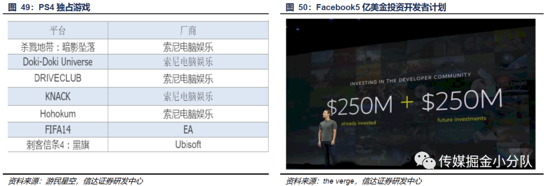 遵循成功先例,Oculus走向游戏独占之路。PS、XBOX每代游戏主机发布时都会有首发独占游戏为产品发行护航,首发游戏的优劣会极大影响产品上市初期的销量。以PS4为例,其2014年上市首发游戏有19款,其中不算合作发行的游戏,单索尼自研独占游戏达到6款,充分体现索尼自研实力。后期索尼也坚持自研推出多款叫好叫座的PS4独占游戏,推动PS4硬件大卖。Oculus也在走游戏独占之路,其早期通过Facebook投资的5亿美金资助各小型VR内容开发商进行合作开发,并将开发的游戏作为独占内容登陆Oculus商店。根据Oculus 内容副总裁的采访,17年Oculus投资水平集中在 100 万-500 万美金之间。大量的投资下产出了《Edge of Nowhere》、《The Unspoken》等优秀独占游戏。