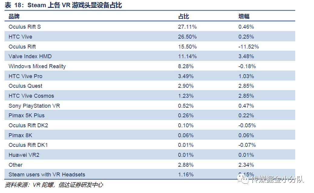 《Half-Life: Alyx》带动Valve Index销量,优质游戏IP存储为Valve内容创作稳定根基,爆款VR游戏有望推动VR设备普及。2020年3月24日,《Half-Life: Alyx》正式开售,IGN给出的10分满分的成绩体现了Valve作为老牌游戏厂商,在游戏研发方面的实力。而本身游戏特性需要Knuckles Controller以获得更好的支持,带动了硬件的销售。Valve由内容带到硬件模式初成立,在2019年末游戏公布后,Valve的Index头显相继在31个国家售罄,数据显示这款VR设备在2019年第四季度卖出了10万份,而其整年销量也只有15万份。目前Steam美国商店,该产品全部售罄。根据steam公布的2020年3月份的数据,在《Half-Life: Alyx》上线的推动下,steam上Valve Index占头显设备比重从上月的7.69%增加至11.14%,增幅最大,达3.48%。此外Rift S、HTC Vive占比较上月都有所增加。另外,3月份VR头显用户在总Steam用户中的占比为1.16%,较上月增加0.15%。