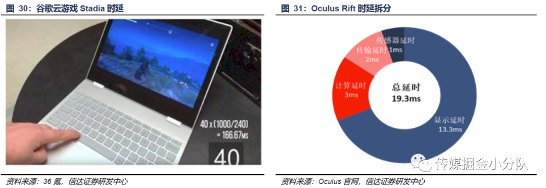 VR云游戏只有在5G时代才能开花结果。VR的云游戏实际上是将渲染放至云端进行,最大的挑战在于网络时延。如果采用了云游戏的技术方案,那么网络时延就变成了运动到成像时延的一部分,网络时延会增加整体的运动到成像时延。目前基于家庭宽带的情况,云游戏的时延约在150毫秒左右。比如,Google的云游戏服务Stadia,经Digital Foundry初步测试,目前的网络状况时延在166毫秒。如果把这样的技术方案使用到VR上来,那一定会让用户因为时延感到强烈晕眩。而5G的低时延特性在此时就能发挥作用,其1ms延迟使得5G的VR云游戏方案就能够达到合格的用户体验需求。通过时延拆分可以看到VR一体机本地渲染与传输时间分别是3ms与2ms。采用5G+元游戏的技术方案,上下传输时间整体为2ms,而云计算采用的是高性能CPU与GPU渲染时间应短于移动机芯片的本地渲染时间。因此5G条件下,相同画面质量,云计算方案传输与渲染整体时延会低于目前的VR一体机。随着5G建设迅速展开,VR云游戏将会凭借较低的硬件成本,更好的画面质量脱颖而出。