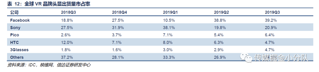 Facebook的Oculus在2019年表现优异,国产VR头显品牌Pico和3Glasses也实现了翻倍式增长。近两年,VR在消费端取得了巨大进步,与此同时全球VR市场格局发生了较大变化。根据IDC发布的2018Q3到2019Q3全球VR品牌销量数据,Facebook的市场份额从2018Q3的18.8%增长到2019Q3的39.2%,成为全球VR头显品牌龙头。虽然2019Q1Facebook的市场份额只有10.5%,主要因为该季度Oculus推出了新品Rift S,停产了旧产品Rift。与此同时,我们发现,期间国产品牌Pico和3Glasses也实现了翻倍式增长,Pico的市场份额从2018Q3的2.6%增长到2019Q3的6.4%,超越了HTC,3Glasses的市场份额从2018Q3的1.8%增长到2019Q3的4.7%,与HTC持平。