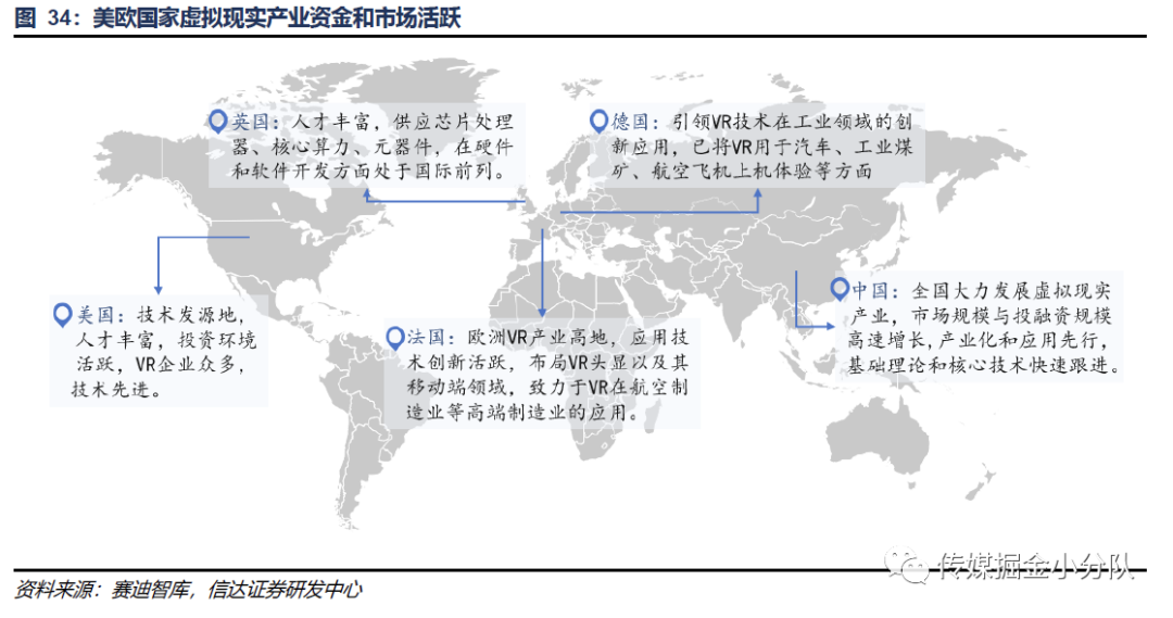 目前来看,VR产业资金活跃度和发展速度较快的主要以美欧发达国家为主,中国快速跟进。美国是VR产业技术发源地,VR产业发展历史悠久,凭借丰富的人才、优越的投资环境以及先进的技术,引领全球VR产业发展。英国的硬件和软件开发能力处于国际前列,尤其是芯片处理器、核心算力和元器件。德国和法国对于VR在制造领域的应用技术创新较为活跃,法国可以说是欧洲VR产业高地,主要布局VR头显及其移动端领域,并致力于VR在航空等高端制造业领域的应用。与美欧发达国家相比,中国的VR产业发展较为落后,但是在政策支持和5G时代背景下,VR产业化和应用先行,基础理论和核心技术有望快速跟进。