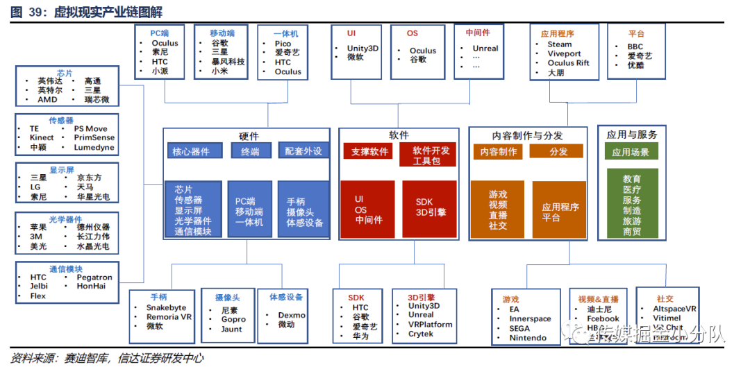 虚拟现实的软件主要为支撑软件和软件开发工具包,支撑软件包括UI、OS和中间件,代表企业有Unity3D、微软、谷歌、Oculus、Unreal等;软件开发工具包包括SDK和3D引擎,代表企业有HTC、谷歌、爱奇艺、华为等。