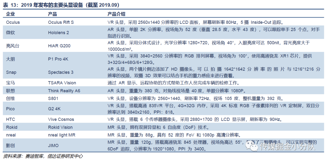 19年VR发布或上市的一体机旗舰级产品主要采用高通骁龙835芯片方案,技术水平落后同期手机芯片。根据VR陀螺的数据,我们统计了19年发布的VR一体机产品的价格区间与芯片方案。可以发现,旗舰级VR产品(价格2000元左右)采用的芯片方案主要为高通骁龙835,占总VR一体机产品发布量比例为41.7%,头部企业HTC与Oculus发布的一体机产品均采用的是该芯片。国产低端产品(1000元左右)主要采用全志VR9国产芯片方案。有部分旗舰产品采用的是三星Exynos芯片。2019年5月21日Oculus Quest VR一体机设备发售,其采用的是高通骁龙835芯片,同期上市的小米9手机采用的是高通骁龙855方案,Oculus Quest落后两代。