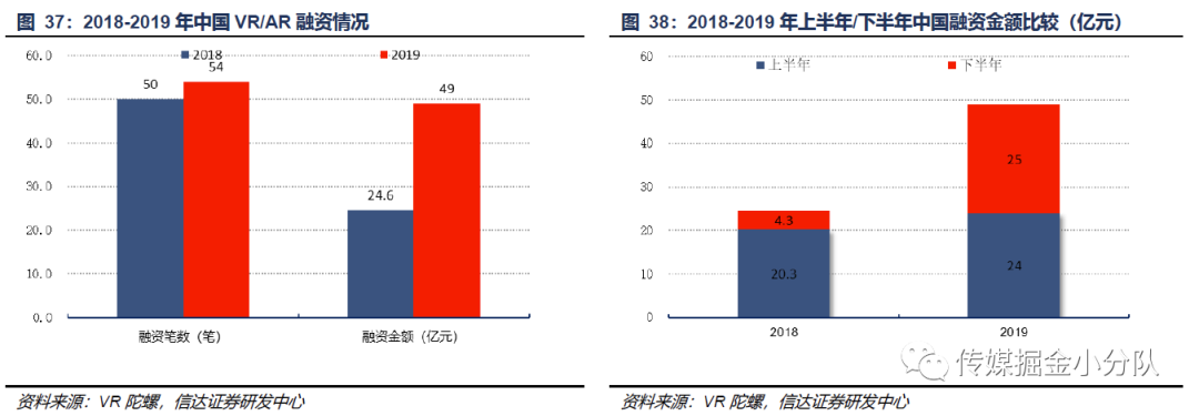 国内来看,2019年VR/AR融资总金额达到49亿元,较2018年增长近一倍,融资笔数为54笔,仅比2018年多4笔。投资笔数基本持平的情况下,投资金额增长近一倍,说明2019年VR/AR的投资活动更加集中深入。2019年下半年融资额相较上半年基本持平,为25亿元,但相比2018年下半年4.3亿元的融资额有较大幅度的增长。