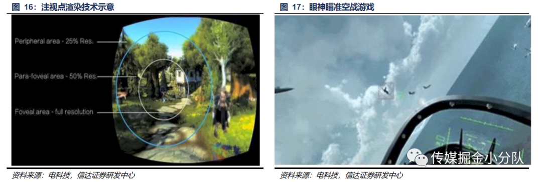 (1)计算方面-基于眼球追踪的注视点渲染技术降低计算门槛。高清的画质是VR体验的基础,目前的渲染方式对硬件要求高、功耗大。通过眼球追踪技术判断人眼注视点,就可以在画面渲染过程中仅全幅渲染注视点位置区域(局部渲染),这样既保证了看到的画面足够清晰,又大幅度降低了渲染过程中GPU负荷,从而降低VR设备对硬件的要求。