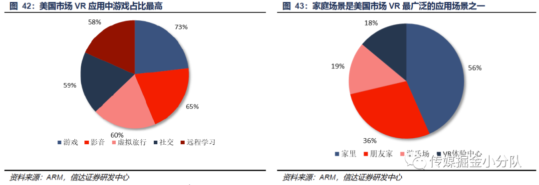 从美国市场的调研数据来看,有73%的美国人使用VR玩游戏,曾使用VR进行影音娱乐、虚拟旅行、社交和远程学习的比例分别有65%、60%、59%、58%。大约13%的VR用户每周玩5次或更长时间VR游戏。主要因为VR技术在交互性和沉浸感上较以往硬件设备有革命性突破,而游戏用户体验的突破关键点恰好是互动的加强和沉浸感的进一步深入,与VR核心技术点匹配度较高。根据ARM的数据显示,家庭场景是VR最广泛的应用场景,说明VR设备已经深入美国家庭的日常应用中,VR的普及度较高,未来带来的市场规模和发展潜力也比较大。