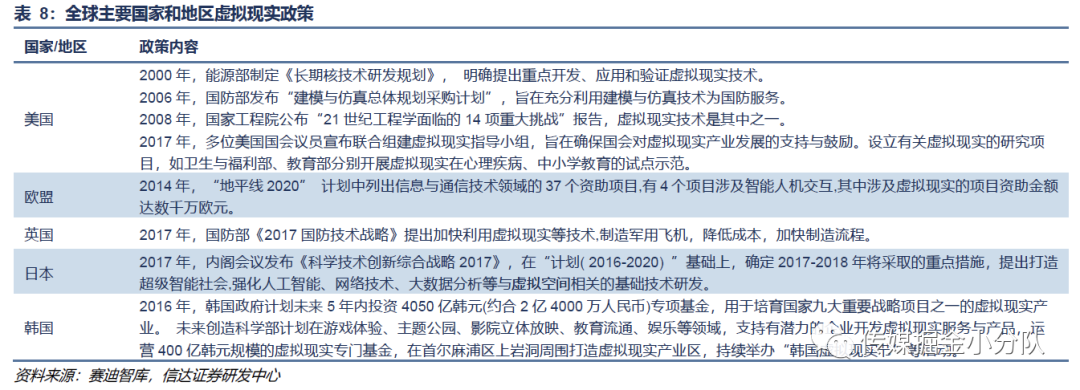 美欧、日韩等发达国家早在这个世纪初就开始推出各种政策支持鼓励虚拟现实产业的发展。早在2000年,美国能源部就制定了《长期核技术研发规划》,明确提出重点开发、应用和验证虚拟现实技术。早期的主要应用方向为国防、信息技术和航空等高端制造,如欧盟在2014年提出的“地平线2020计划”列出信息与通信技术领域的37个资助项目,其中有4个项目涉及智能人机交互,涉及虚拟现实的项目资助金额达数千万欧元。2017年美国开始探索虚拟现实在心理疾病和中小学教育领域的应用。2016年韩国政府计划未来5年内投资4050亿韩元(约合2.4亿元人民币)专项基金,用于培育虚拟现实产业,计划在游戏体验、主题公园、影院立体放映、教育流通、娱乐等领域支持有潜力的企业开发虚拟现实服务与产品,运营400亿韩元规模的虚拟现实专门基金,在首尔麻浦区上岩洞周围打造虚拟现实产业区,持续举办“韩国虚拟现实节”等活动。