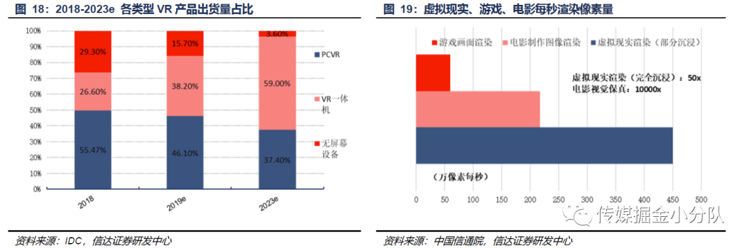 追求性能之后目前VR设备的发展方向趋于小型轻量化,VR一体机是目前小型轻量化的选择。PC端VR头盔对于使用者而言,因为画面渲染需要在PC完成,需要连接线和外接设备,活动区域受限制,这极大程度上影响了用户体验。VR一体机是目前小型轻量化的选择,其摆脱了依附在其他计算终端上的限制,本地运行时依赖内置处理器渲染,同时其能无线传输数据,在5G时代接入5G网络后应用场景更加广泛。根据IDC数据,2018年国内VR一体机市场呈飞速增长态势,增幅达到123.6%。VR市场由44.1%的PCVR头显,26.6%的VR一体机和29.3%的无屏幕设备组成,预计2019年VR一体机市场占有率将提高11.6%。2023年VR一体机将占据市场出货量的59%。根据BaDoinkVR的数据,2019年VR一体机消费者数量逐渐增加,该类型的占比已有60%。
