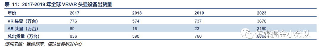 2)VR/AR销售额口径:根据IDC的调研数据,2020年全球AR/VR的销售额预计将达到188亿美元,较2019年的105亿美元增长78.5%。2019-2023预计全球在AR/VR产品和服务上的支出将继续保持强劲增长,实现五年复合年增长率77.0%。消费者支出将由两个大型部分主导:VR游戏(33亿美元)和VR观影(14亿美元)。从地域上看,中国将在2020年实现最大的AR / VR支出(58亿美元),其次是美国(51亿美元),西欧(33亿美元)和日本(18亿美元)。