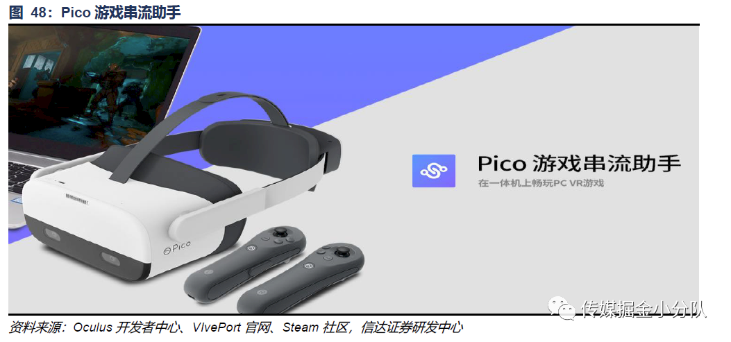 移动VR内容平台布局上Quest与VivePort受SteamVR串流影响。除了PCVR以外Oculus、HTC与绝大多数中国厂商都在进一步开发VR一体机,VR一体机采用的系统底层都是安卓系统,基于PCVR开发的游戏内容无法在一体机上运行。在PC端受阻的情况下,移动内容平台布局成为Oculus、HTC的重点。但受限于一体机本身孱弱的性能,其游戏体验差强人意。而通过SteamVR串流,用户可以使用一体机在家庭5GWI-FI网络下体验电脑端的VR应用,获取更好的游戏体验,这一定程度上会影响Oculus与HTC在移动平台上的布局。如一体机生产商PICO,虽然内置了VivePort商店,但也推出软件Pico游戏串流助手,帮助用户串流SteamVR,游玩相关游戏。一体机VR设备的加入,进一步增加了SteamVR用户量。