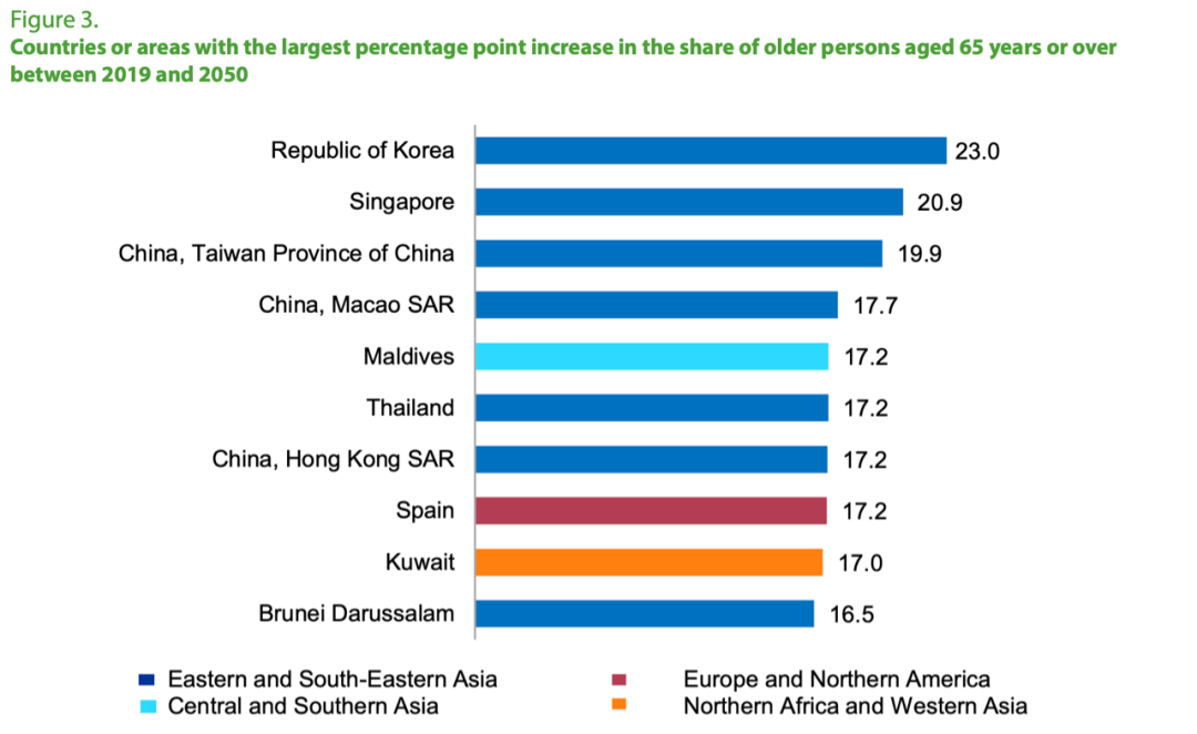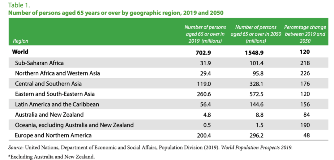2019年10月,联合国经济社会部门(Department of Economic and Social Affairs)发布了关于全球老龄化的报告。报告称,当下全球65岁以上的人口为7.03亿(占总人口约11%),到2050年,这一数字预计将达到15亿。根据联合国经社部人口司的最新人口估计和预测,2019年,约9%的人口超过 65岁,到2050年这个数字将上升为17%。最新的预测还显示,在未来30年中,年龄在80岁或80岁以上的人数将增加两倍。到2050年,在许多地区的65岁的人口将增加一倍。报告指出,这一现象在全球范围内存在,但是在东亚和东南亚地区极为明显。