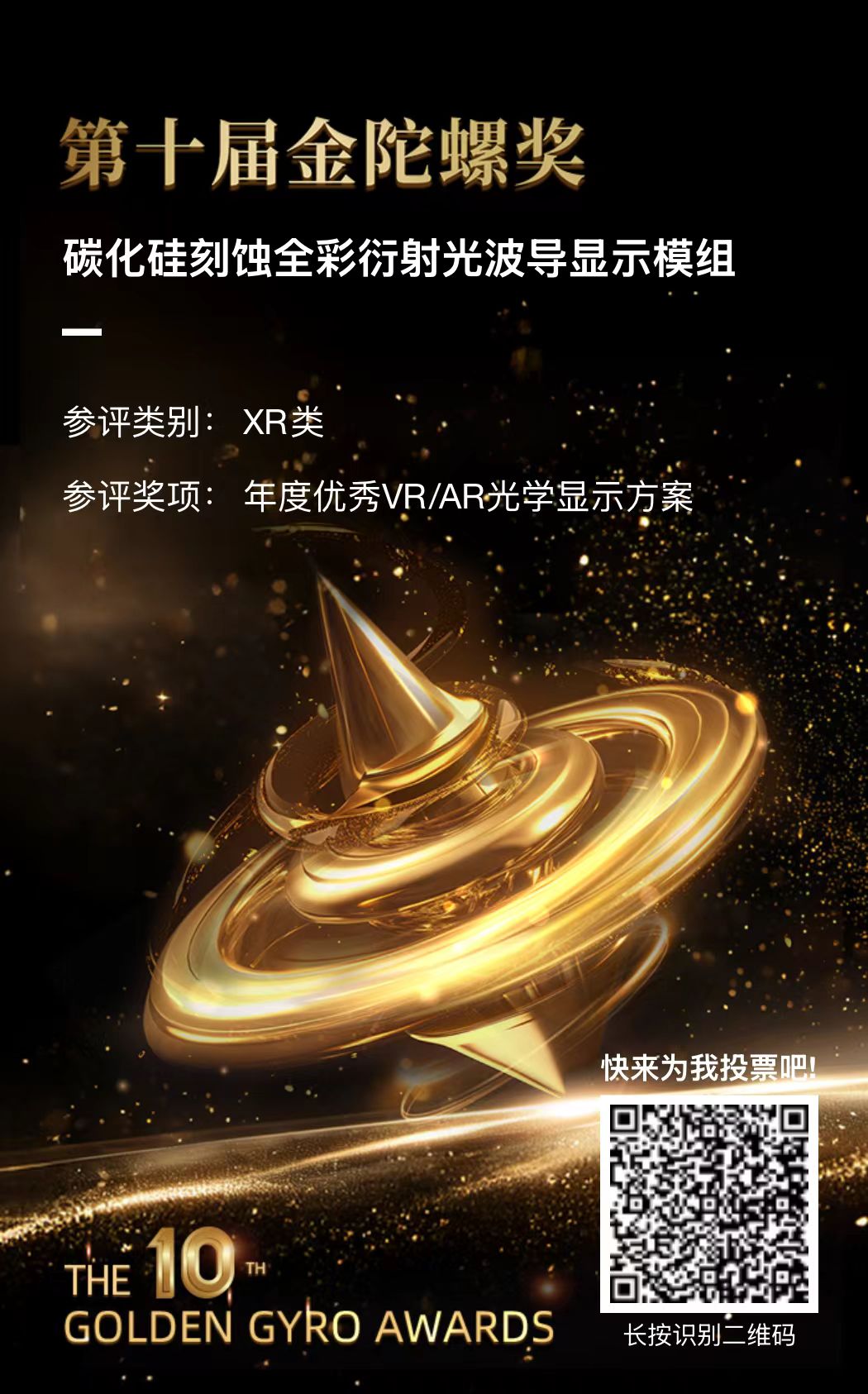 即日起,VR陀螺将对参评的优质企业/游戏项目进行精选展示,本次展示的是:歌尔光学-碳化硅刻蚀全彩衍射光波导显示模组
